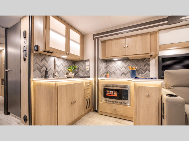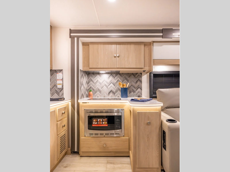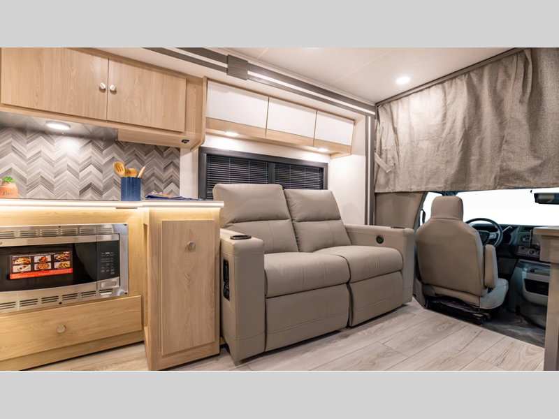 The rear air ride suspension reduces driver fatigue, increases the roll stability, and delivers a consistent vehicle ride height for a smoother ride. Dual 15,000 BTU A/C's with heat pumps will keep you cool on a hot summer day, and the 50 amp service with electric power reel will keep you powered. Fill your bellies with delicious home cooked meals out on the road with the two burner induction cooktop and residential convection microwave!