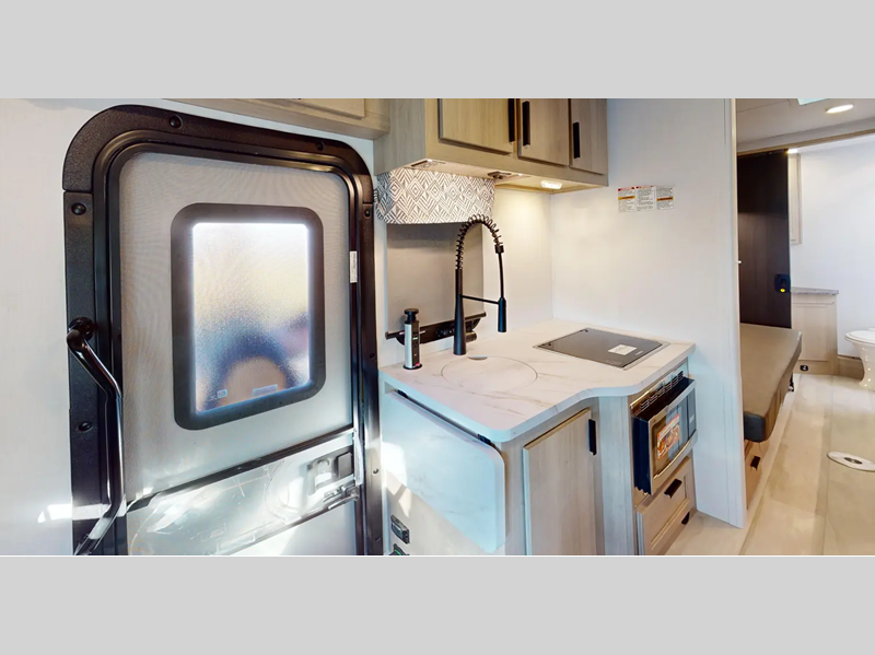 Sleeps 3 Length 25 ft 6 in Ext Width 7 ft 3 in Ext Height 10 ft 5 in Int Height 6 ft 6 in GVWR 10360 lbs Fresh Water Capacity 35 gals Grey Water Capacity 30 gals Black Water Capacity 30 gals Generator 2.8kW Onan Gas Fuel Type Gas Engine Ford EcoBoost 3.5L Chassis Ford Transit Fuel Capacity 25 gals Wheelbase 178 in Available Beds Full Refrigerator Type LP Electric Refrigerator Size 5.3 cu ft Convection Cooking Yes Shower Size 24" x 32" Number of Awnings 1 Axle Weight Front 4130 lbs Axle Weight Rear 7275 lbs LP Tank Capacity 41 lbs Water Heater Type Truma Combi AC BTU 13500 btu Basement Storage 29 cu. ft. TV Info LR 12V LED Flat Panel TV, BR 12V TV Awning Info 14' Power with LED Lights Gross Combined Weight 13500 lbs Shower Type Standard Electrical Service 30 amp Similar Floorplans
