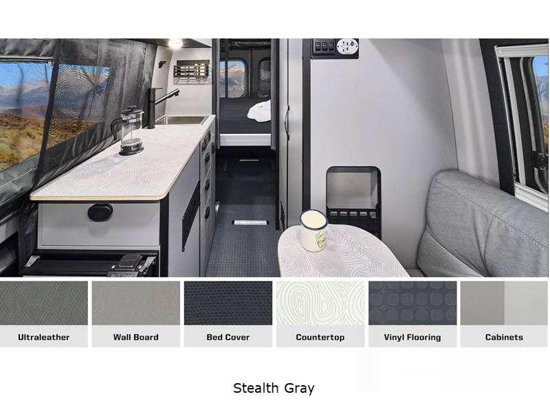 Sleeps 2 Length 19 ft 7 in Ext Width 7 ft 5 in Ext Height 10 ft Int Height 6 ft 3 in Interior Color Overlander, Stealth Gray Exterior Color Silver Grey, Stone Grey, Selenite w/RAPTOR/RAPTOR+ Tough & Tintable Protective Coating Hitch Weight 5000 lbs GVWR 9050 lbs Fresh Water Capacity 35 gals Grey Water Capacity 21 gals Fuel Type Diesel Engine 2.0L 4-Cylinder Turbo Chassis Mercedes Benz Sprinter AWD Fuel Capacity 24.5 gals Wheelbase 144 in Refrigerator Type 12V Compressor Driven Refrigerator/Freezer Refrigerator Size 3.0 cu ft Cooktop Burners 1 Shower Size 31" x 26" Axle Weight Front 4409 lbs Axle Weight Rear 5359 lbs Water Heater Type Continuous Gross Combined Weight 13930 lbs Shower Type Wet/Bath Shower Electrical Service 30 amp Solar Wattage 210 watts -