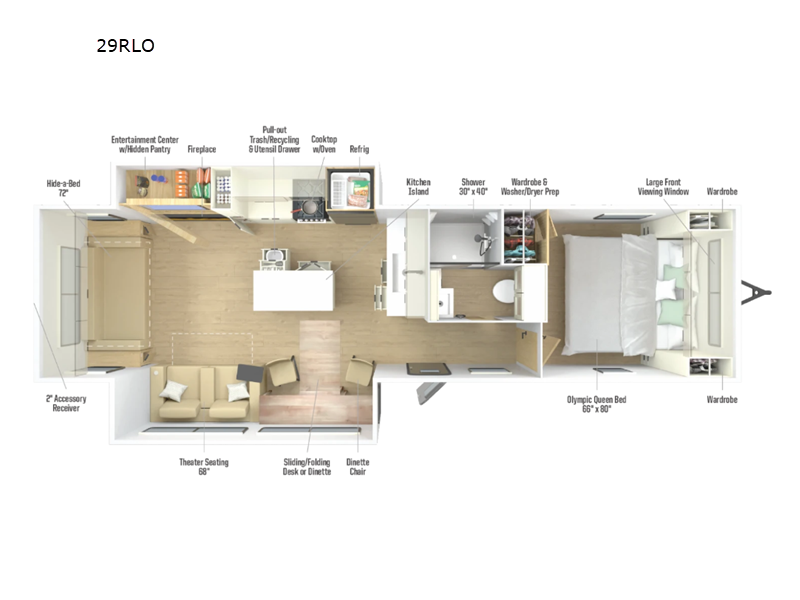 Sleeps 3 Slides 1 Length 29 ft 4 in Ext Width 8 ft Ext Height 11 ft 4 in Int Height 6 ft 8 in Interior Color Modern Luxe Hitch Weight 770 lbs GVWR 8800 lbs Dry Weight 6480 lbs Fresh Water Capacity 60 gals Grey Water Capacity 49 gals Black Water Capacity 49 gals Tire Size 225/75R15E Furnace BTU 30000 btu Available Beds Olympic Queen Refrigerator Type 12V Refrigerator Size 10.6 cu ft Cooktop Burners 3 Shower Size 30" x 36" Number of Awnings 1 Axle Weight 4400 lbs LP Tank Capacity 40 Water Heater Type Tankless AC BTU 15000 btu TV Info LR Smart TV Awning Info 19' Powered patio awning w/LED lighting Axle Count 2 Washer/Dryer Available Yes Number of LP Tanks 1 Shower Type Standard Electrical Service 30 amp Solar Wattage 200 watts Similar Floorplans